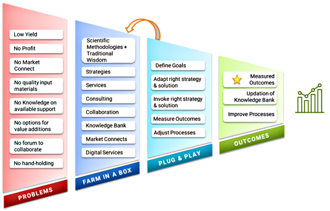 Farm-in-a-Box is a unique framework that encompasses scientific farming methods blended with local wisdom powered by cutting-edge digital technologies.It contains farming strategies, services such as farm implementation, consulting for value-added services such as food processing, opportunities for procurement, expert advice to farm maintenance issues, etc. as well. Simply saying, you can call it a plug-and-play framework that fits most of the farming needs of plant and animal crops. It is always better to identify the outcome first and work backward to make it a reality. In achieving those goals, you can employ the capabilities offered by Farm-in-a-Box which is getting enriched by the learning from every project executed.